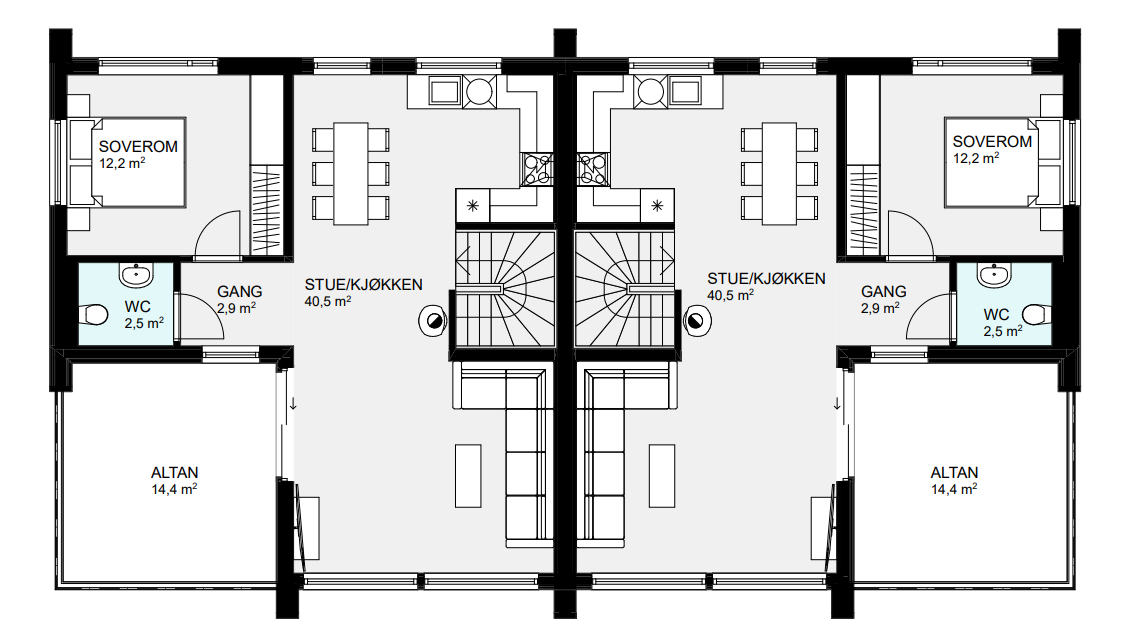Denne stilrene og moderne tomannsboligen har to identiske boenheter med fire soverom, to bad og et kontor. I tillegg har boligen et praktisk vaskerom med egen utgang. I boligens andre etasje finner du en stor og romslig stue-/kjøkkensone, perfekt for deg som vil samle familie og venner. Herfra kan du også ta deg ut på boligens altan.