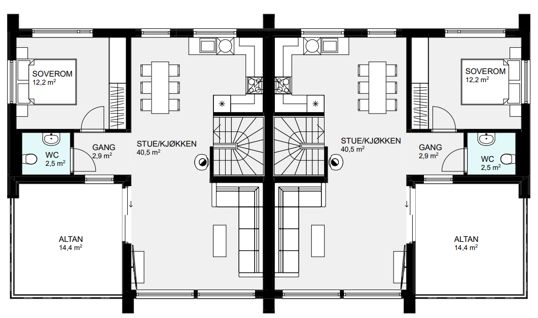 Denne stilrene og moderne tomannsboligen har to identiske boenheter med fire soverom, to bad og et kontor. I tillegg har boligen et praktisk vaskerom med egen utgang. I boligens andre etasje finner du en stor og romslig stue-/kjøkkensone, perfekt for deg som vil samle familie og venner. Herfra kan du også ta deg ut på boligens altan.