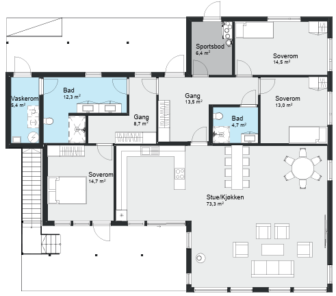 Den åpne stue- og kjøkkenløsningen på over 70 m² gir en flott arena for alt fra hverdag til fest, med direkte utgang til uteområder og takterrasse. Dette gir mulighet for mange ulike soner – enten du vil nyte ettermiddagssol, samle venner, eller bare trekke deg litt tilbake.