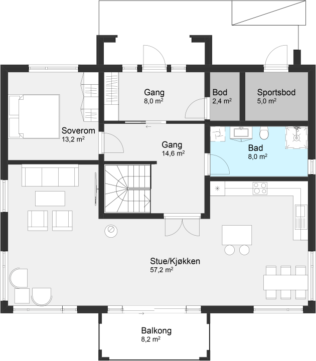 Hovedplanet har en romslig stue- og kjøkkenløsning med direkte utgang til uteområdet. Høydepunktet er likevel takterrassen på 65 m² – perfekt for alt fra morgenkaffe til selskap på sommerkvelden.