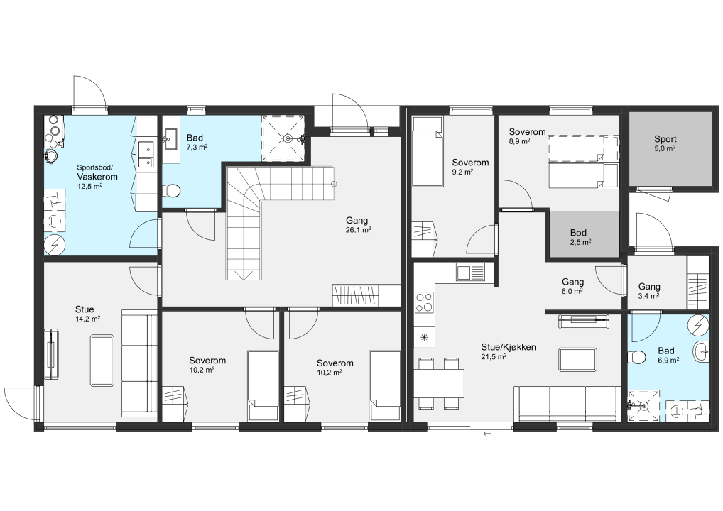 Hoveddelen har et stort og lyst oppholdsrom på over 80 m², med flere soner for både samvær og ro. Hovedsoverommet byr på egen walk-in garderobe i egen avdeling. Med smarte løsninger og mye plass er Kvalsvik et hjem som vokser med dine behov!