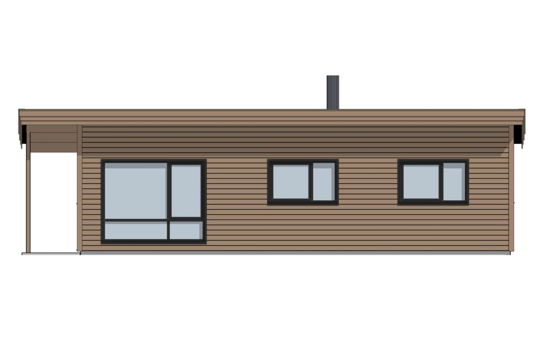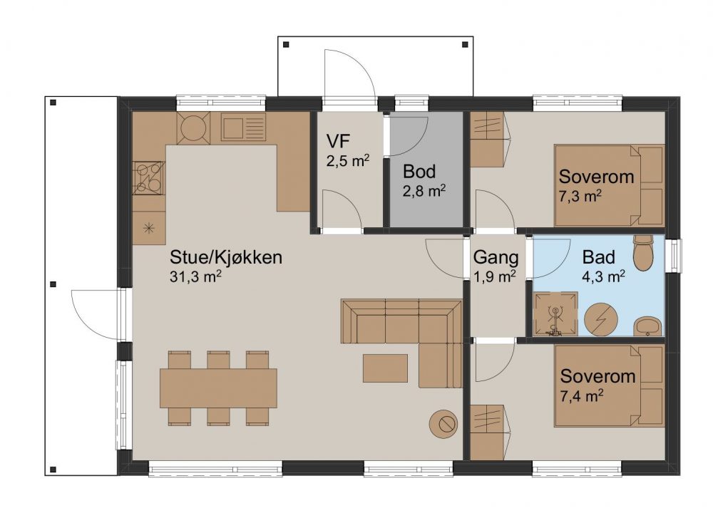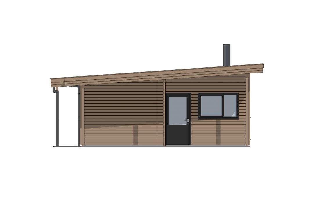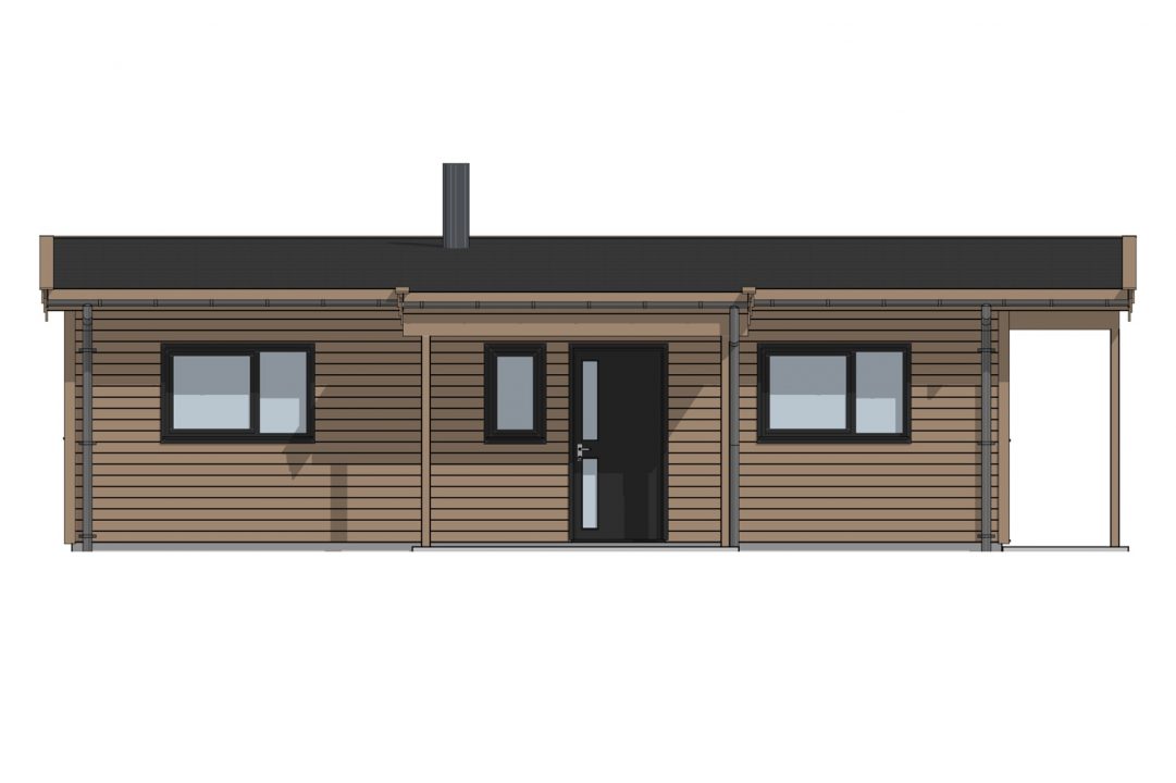 Du kommer inn i hytten gjennom et overbygd inngangsparti som skjermer for vær og vind. Vindfanget leder deg videre til en praktisk bod og til allrommet, en innholdsrik stue-/kjøkkenløsning hvor skråtak gir følelsen av et luftig rom med god plass. Her har du en egen kjøkkenkrok, en spise-sone og nok rom til en sittegruppe med sofa og gode lenestoler foran peisen. Vi har plassert vinduer og verandadører i glass i stue-/kjøkkenavdelingen for at du kan nyte utsikten og naturen utenfor gjennom alle årets sesonger. Den overbygde uteplassen gir deg muligheten for fine stunder ute i frisk luft. Fra allrommet kan du gå videre til en gang som leder deg til hyttens to soverom og et praktisk baderom.