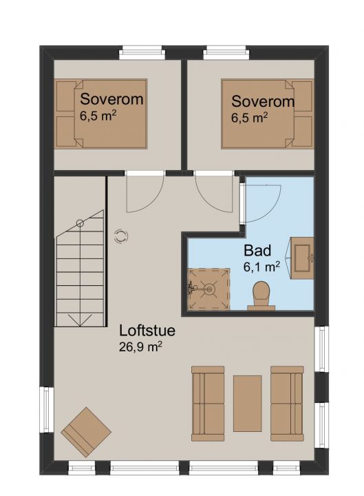 I hyttens andre etasje finner du to soverom, et badeværelse og en loftstue hvor vinduer dekker store deler av gavlveggen. De store vinduene, i tillegg til åpen himling skaper et lyst og åpent rom hvor du kan nyte utsikt over sjø og bølgeskvulp når det er for kaldt til å sitte utendørs.